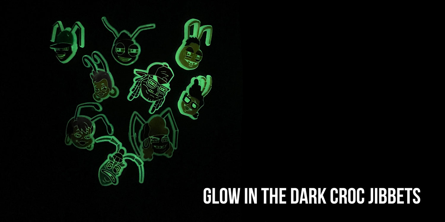 Glow In the dark croc charms of your favorite Roach Motel characters